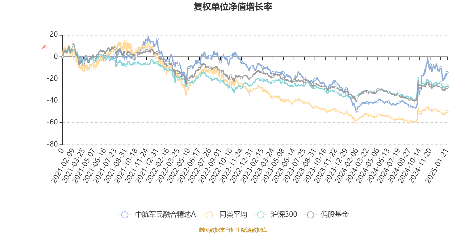 截至1月21日,中航军民融合精选A近三个月复权单位净值增长率为2.69%,位于同类可比基金53/182;近半年复权单位净值增长率为46.17%,位于同类可比基金10/182;近一年复权单位净值增长率为47.40%,位于同类可比基金4/174;近三年复权单位净值增长率为-14.13%,位于同类可比基金16/109。
